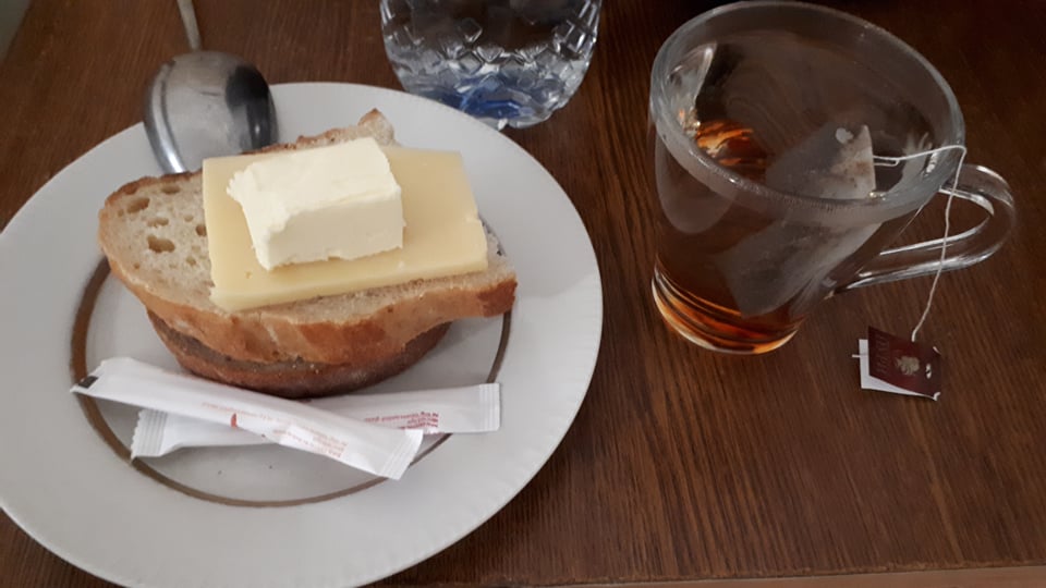 На завтрак весь этаж получил по два куска хлеба, кусок сыра, кубик сливочного масла и чай с сахаром — это стандартный завтрак, который будет повторяться каждый день.