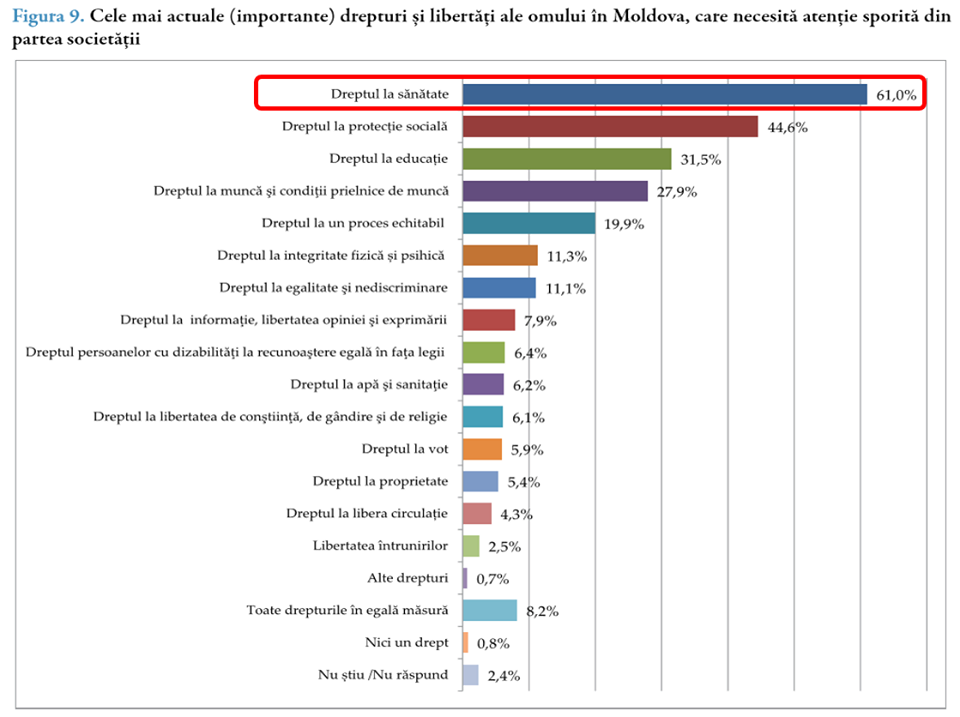 Пять лет назад, в 2015, я работал в Программе развития ООН в Молдове, координируя портфолио по правосудию и правам человека. Вместе с Управлением верховного комиссара ООН по правам человека мы реализовывали проект, направленный на развитие Офиса народного адвоката (ОНА) и Совета по равенству. Одним из мероприятий было проведение совместно с ОНА национального социологического исследования о восприятии людьми прав человека в стране, которое мы опубликовали в 2016 году. Ключевым результатом для нас стал список прав, которые респонденты посчитали для себя самыми проблемными, несоблюдаемыми. На первом месте в этом антирейтинге оказалось право на здоровье — его назвали проблемным 61% респондентов.